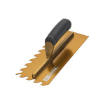 The 12mm NotchTile is a gold-colored professional adhesive spreading trowel with a distinctive laser-cut two-step H45 notch pattern. It is specifically made to undercut adhesives and allow ridges to collapse with minimal pressure, providing maximum coverage.