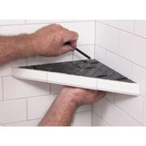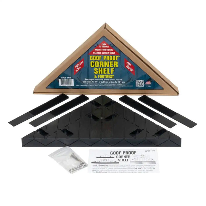The Goof Proof Corner Shelf and Footrest is a strong, stay-in-place, molded plastic form to add a shelf into any 90° vertical corner. The 14" uncut Corner Shelf has guidelines on the top surface for cutting the shelf to the optional 10" Footrest size as a leg shaving support.
