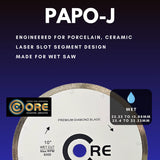 This blade introduces an innovative J-Slot segment design with laser slots for improved performance. The PAPO-J is designed for wet-cutting applications and showcases a bond mainly suited for porcelain.
