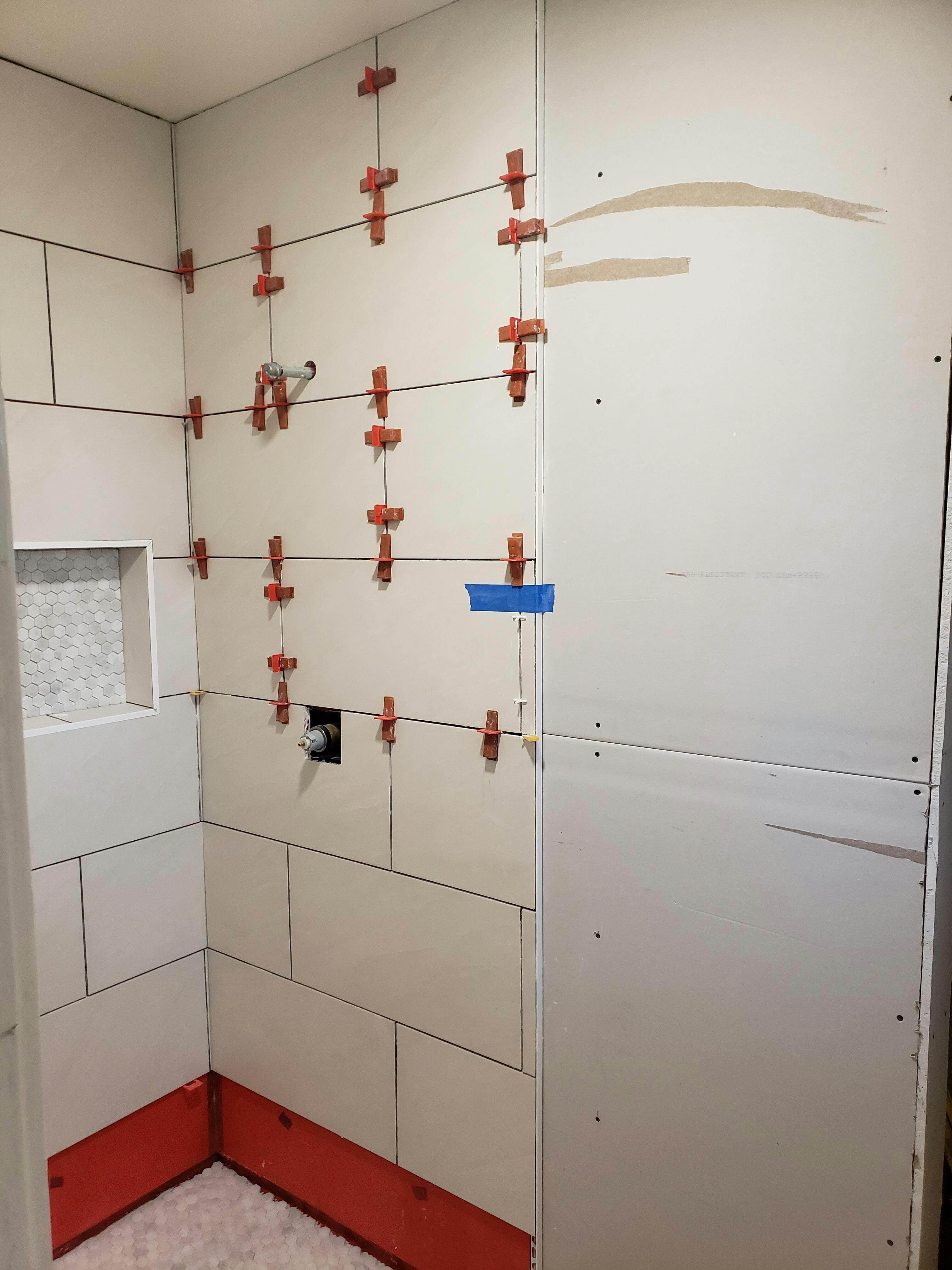 - STEP 1: After spreading your tile adhesive, insert a leveling spacer underneath the tiles along the 4 sides; use traditional spacers as you usually would to square up the corners. For larger tiles, it may be necessary to "double up," using 2 leveling spacers for each side