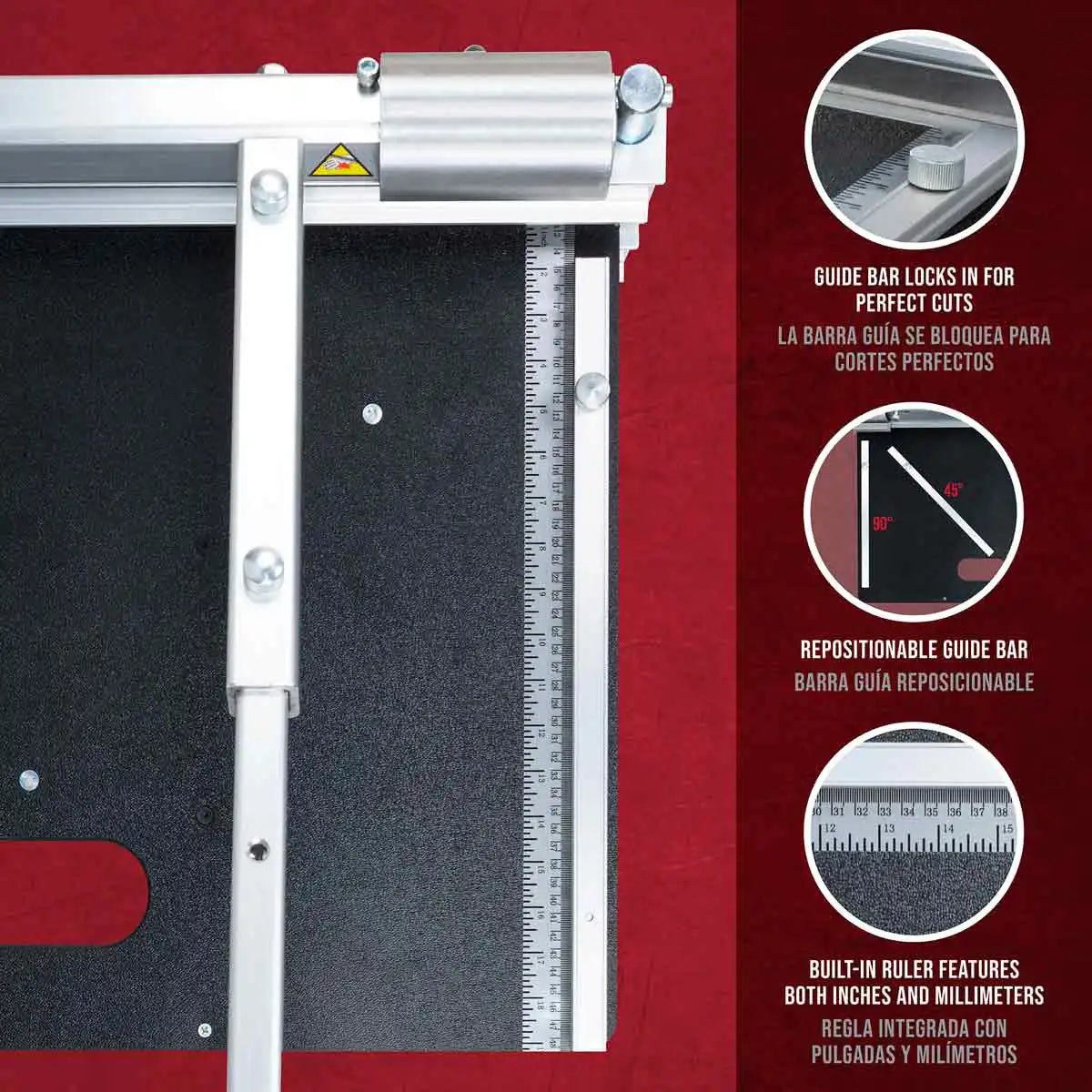 - The locking guide bar screws down into position for straight or angled cuts