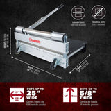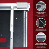 ROBERTS 25" PrecisionCuts Pro Multi-Floor Cutter is designed to quickly cut carpet tile, laminate, engineered wood flooring, vinyl flooring, siding, VCT tile, PVC and other flooring applications. This PrecisionCuts Pro Multi-Floor Cutter accommodates straight edges or angled cuts up to 5/8” (16 mm) depth. It features a steel-encased cam with ball bearings for smooth and powerful cutting action, a long-lasting resharpenable, replaceable, 4 mm thick tungsten blade, and a built-in light for precise cutting. It has a built-in ruler with both inches and millimeters and a larger hand grip opening in the table that makes it easier to hold and carry along.