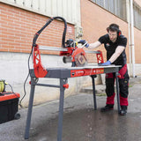 The DC-250 Python is a professional saw for cutting porcelain, stoneware, and ceramic tiles. It features a 1.5 HP engine and a movable head for wet cutting with a mitering effect.