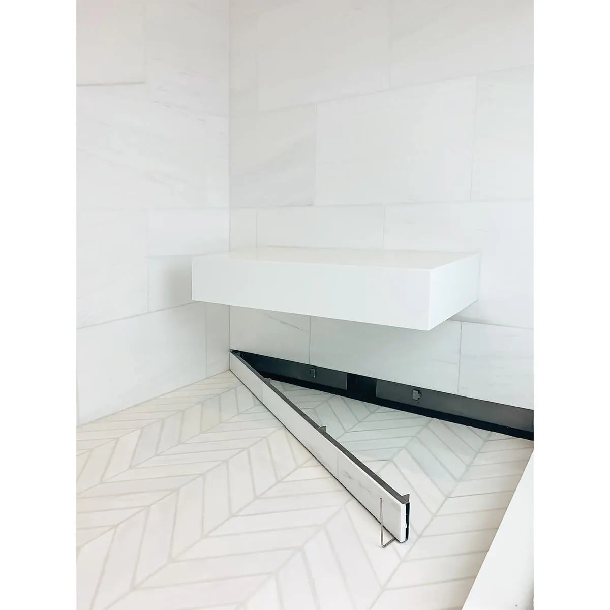 - It can be installed directly beneath a shower bench for a distinctive shower aesthetic